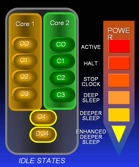Begibt sich der Prozessor nun in diesen Modus, so werden alle Daten die sich im Cache befinden in den Hauptspeicher verschoben und der Cache wird geleert. Dadurch, dass die Daten im Cache nicht weiter erhalten werden müssen, kann so die Spannung für den Prozessor auf ein Minimum reduziert werden. Bis hier hin unterscheidet sich der Enhanced Deeper Sleep nicht vom bisherigen Ablauf des Tiefschlafs. Allerdings sprechen sich nun Prozessor und Chipsatz beim Übertritt in den Enhanced Deeper Sleep ab, sodass sowohl Chipsatz als auch Prozessor zusammen in einen niedrigen Verbrauchszustand übertreten. Dadurch, dass der Chipsatz fort an weiß, dass die CPU sich im Ehanced Deeper State befindet, fängt der Chipsatz gewisse Zugriffe ab und verhindert dadurch, dass der Speicher-Controller bei unwichtigen Vorgängen jedesmal versucht auf den eigentlich leeren Cache zuzugreifen, was den Prozessor wieder aus dem Schlafmodus holen würde. Als Ergebnis dieses neuen Modus bleibt die CPU so lange wie möglich im DC4-State, indem sie mit einer minimalen Spannung betrieben wird und somit Strom einsparen kann.