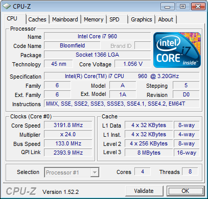Den Intel Core i7-960 konnten wir auf fast 4 GHz Kernfrequenz beschleunigen, was einer Steigerung von etwa 800 MHz bzw. satten 25 Prozent entspricht. Der Takt setzt sich aus 166 MHz x 24 zusammen. Dafür musste die Vcore auf 1,35625 Volt (BIOS-Einstellung) angehoben werden, was sich wiederum in einer Temperatur von 86 °C unter Volllast niederschlug. Hierbei wurde der Arbeitsspeicher bei 1333 MHz und 1,64 Volt betrieben. Die QPI-Spannung betrug 1,375 Volt. Die Plattform lief unter diesen Einstellungen 12 h Prime95 und Goldmemory stable.