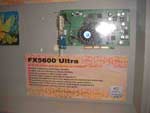 Neben den bereits bekannten Leistungen der neuen NV30 Platinen, suchten wir auch nach lauffähigen GeForce FX 5200 oder 5600 Systemen, doch leider vergeblich. Daher richteten wir uns Hauptaugenmerk auf die verschiedenen Kühlungen der NV30-Platinen. Sehr interessant waren hier die Stände von Gainward, TerraTec, Leadtek und Thermaltake, wobei man die Gainward-Karte mit Wasserkühlung nur im Hinterzimmerchen gezeigt bekam (Bilder unten). Thermaltake setzte wie gewohnt auf seine Heatpipe-Lösung, die offensichtlich auch den NV30 bei Laune halten soll. Ein laufendes System mit der neuen Thermaltake-Kühlung konnten wir leider nirgends finden. Folgend nun ein paar Impressionen der verschiedenen GeForce FX Platinen...