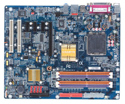 So, abschließend kommen wir nun auch noch zu einer "Billig"-Express Plattform und einem durchaus interessanten Sockel 479M Motherboard - beginnen wir mit der i915P Grantsdale Platine: Gigabyte GA-8I915P-G. Die Gigabyte GA-8I915P-G ist eine wirklich preisgünstige Platine (etwa 80 Euro) die besonders den Umstieg von 478 auf 775 erleichtern bzw. deutlich billiger gestalten soll, da das Board auch noch auf herkömmlichen DDR-Speicher und nicht auf DDR2 setzt. Ansonsten kann das Board für den kleinen Preis noch recht gute Ausstattung bieten: Gigabit-LAN, HD Audio, Serial-ATA und natürlich auch PCI Express.