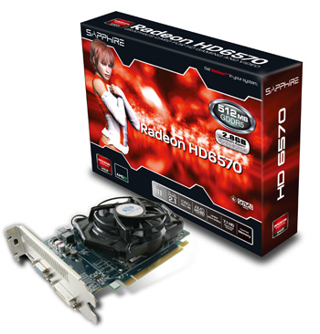 Für den kleinen Geldbeutel gibt es die Radeon HD 6570 Familie von Hersteller Sapphire, die alle Funktionen der 6000er Serie besitzt, aber hinsichtlich Performance leicht abgespeckt wurde. Die HD 6570 ist eine Dual-Slot-Grafikkarte in voller Bauhöhe mit 512 MB GDDR5 Speicher und einem Speichertakt von 4 GHz (effektiv) bzw. einem Chiptakt von 650 MHz. Dank der HyperMemory-Technologie kann der für Grafikberechnungen verfügbare Speicher dynamisch durch den Arbeitsspeicher des Systems erweitert werden. Bei einem PC mit 4 GB Hauptspeicher kann die Radeon HD 6570 HyperMemory mit 512 MB GDDR5 effektiv über 2 GB verwenden.