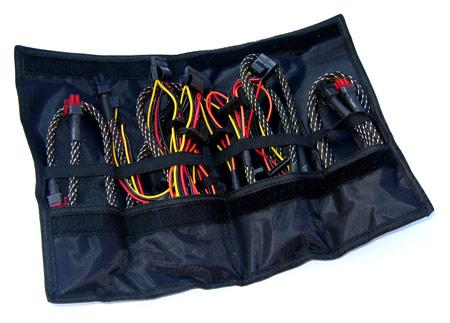 Enermax hat bei der Umsetzung der DXX-Serie Modularität im klassischen Sinne integriert. Darunter verstehen wir genormte Buchsen am Netzteil selbst, die sich mit beliebigen Kabeln aus dem Lieferumfang bestücken lassen. So hat der Benutzer volle Kontrolle über die Anschlussvielfalt und kann auch gezielt auf sehr spezielle PC-Systeme (beispielsweise viele Festplatten aber keine PCIe-Karten) eingehen. Direkte Variationen in der jeweiligen Kabellänge, wie wir es zuletzt beim NesteQ E²CS Netzteil mit 500 Watt gesehen haben, gibt es hier nicht. Der Lieferumfang seitens der Kabel besteht bei der aktuellen DXX-Version grundlegend aus Folgendem: 2x 68 cm Kabel mit je zwei Molex- und SATA-Steckern, 2x 93 cm Kabel mit je zwei SATA- und Molex-Anschlüssen sowie einem Floppy-Stecker, 1x 48 cm PCI Express Stromversorgung (6 Pin), 1x 48 cm PCI Express Stromversorgung (6+2 Pin). Das nahe Beeinanderliegen von Molex- und SATA-Steckern bezeichnet Enermax offiziell als "Eternity Connector-Design" und soll stets den richtigen Anschluss für anzuschließende Geräte bereithalten.