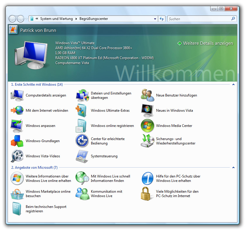Der Begrüßungscenter zeigt alle zentrale Punkte im Überblick und erleichtert den Einstieg und die Erstkonfiguration von Windows Vista.