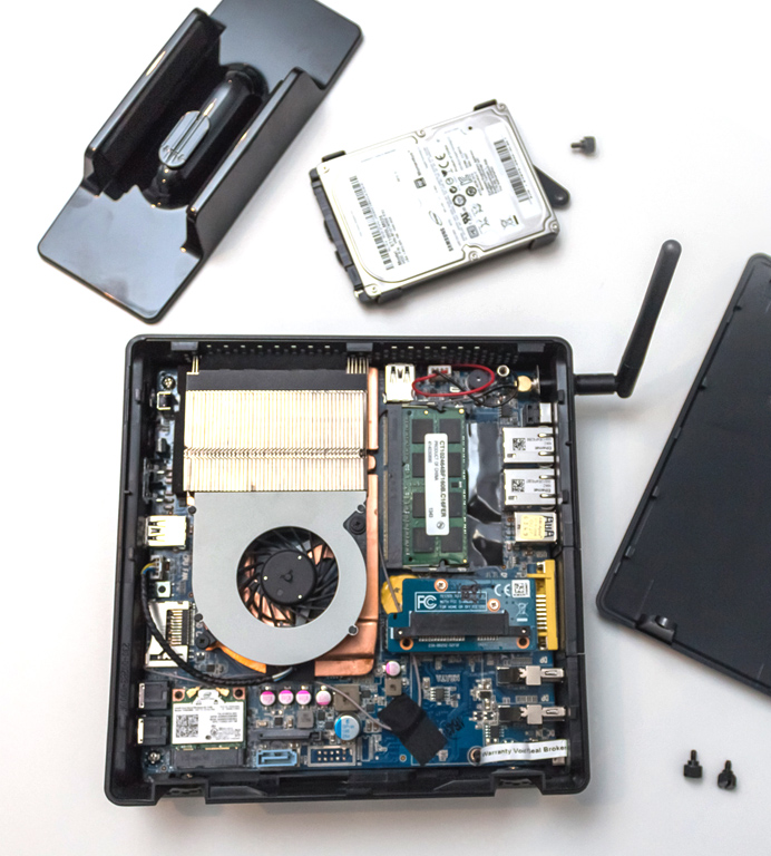 Seitens der externen Schnittstellen hat der Winzling auch einiges anzubieten. Auf der Rückseite des schlanken Gehäuses finden wir einen S/PDIF-Ausgang für optische Audioübertragung, Dual-Gigabit-Ethernet, zwei USB 3.0 Ports, DVI-D sowie zwei DisplayPort-Anschlüsse. Ebenso wird das externe Netzteil auf der Rückseite eingesteckt. Auf der Oberseite hat man unter einer kleinen Gummikappe einen weiteren USB 3.0 Port versteckt, der beispielsweise für das unkomplizierte Einstecken von USB-Speichern verwendet werden kann. An der Vorderseite findet man einen Infrarot-Sensor, zwei 3,5 mm Klinken-Buchsen (Kopfhörer und Mikrofon), einen 4-in-1 Kartenleser (MMC/SD/SDHC/SDXC) sowie einen weiteren USB 3.0 Port – USB 2.0 ist bei der neusten ZBOX von ZOTAC kein Thema mehr. Ergänzt wird die Front durch zwei Aktivitäts-LEDs. Drahtlose Schnittstellen sind mit WLAN gemäß 802.11a/b/g/n/ac Standard sowie Bluetooth 4.0 ebenso vorhanden und jeweils auf aktuellem Stand der Technik.