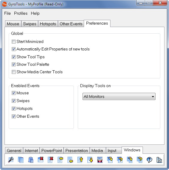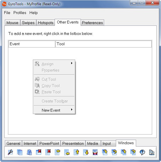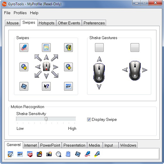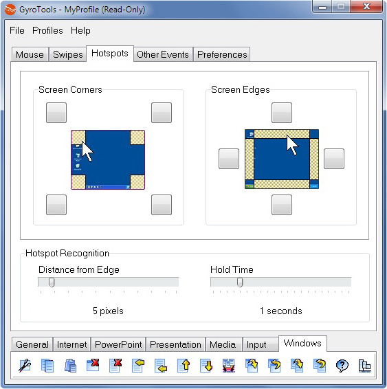 Mit den GyroTools legt Hersteller Gyration der Air Mouse eine sehr umfangreiche Software bei. Diese verbraucht gerade einmal sechs Megabyte Speichervolumen und wird sich somit problemlos überall installieren lassen. Hierbei sollte man noch erwähnen, dass die Maus auch ohne diese Software vom PC erkannt wird und sofort verwendet werden kann. In dem Programm GyroTools gibt es unzählige Einstellungsmöglichkeiten, die speziell für den Luftbetrieb individuell eingerichtet und unter verschiedenen Profilen abgespeichert werden können. Der Programmaufbau gestaltet sich durchgehend logisch, die Bedienung erfolgt intuitiv. Die Funktionen sind in sinnvolle Gruppen eingeteilt. Es gibt auch schon vorgefertigte Profile, die einfach aufgerufen werden können. Im ersten Reitermenü kann man die grundlegenden Mauseinstellungen ändern, in den weiteren Menüs geht es hauptsächlich um das Eventmanagement bei verschiedenen Luftbewegungen und Führungsrichtungen. So kann man zum Beispiel Bildschirm-positionsbezogene Ereignisse einprogrammieren, hier unter dem Punkt Hotspots: