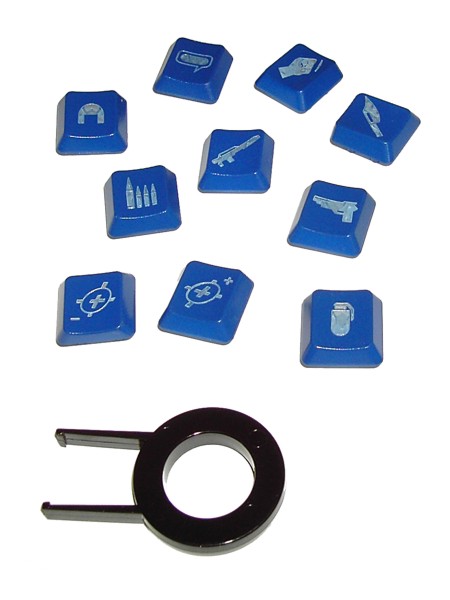 In der oberen Tastenleiste finden wir außerdem die Taste ‚Profile’. Diese dient dazu, ein vorher konfiguriertes Tastaturprofil aufzurufen. Dabei wird es dem Anwender ermöglicht, etwa für ein bestimmtes Spiel die Tastatur anders zu belegen und diese Einstellung abzuspeichern. Insgesamt bietet die Tarantula 100 solcher Profile, von denen 5 allerdings auch ohne Treiber abrufbar sind. Diese Profile und deren Funktion sehen wir uns im Abschnitt ‚Software’ genauer an. Neben dem eigentlichen Tastaturfeld sind rechts und links insgesamt 10 Tasten angeordnet (die sog. Hotkeys), die sich mit einer Anwendung oder mit Makros bzw. Tastaturkürzeln belegen lassen. Darüber hinaus können hier die mitgelieferten Tasten zum Einsatz kommen. Auf diesen Ersatztasten finden sich verschiedene Symbole, etwa eine Granate oder Munition, so dass man die seitlichen Tasten einfach gegen diese Symboltasten austauschen kann, wenn man eine bestimmte Funktion wie etwa den Waffenwechsel auf die Hotkeys legen möchte. Allerdings kann man jede beliebige andere Taste des Keyboards gegen eine dieser Tasten austauschen.