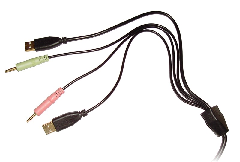 Darüber hinaus ist die Tastatur an der Rückseite mit zwei USB-Anschlüssen ausgestattet, die allerdings nur den USB 1.1-Standard unterstützen. Zusätzlich finden wir zwei handelsübliche 3,5 mm-Buchsen für Kopfhörer und Mikrofon, die ebenfalls an der Rückseite neben den USB-Anschlüssen angeordnet sind. Die Realisierung der Anschlüsse am Rechner wird über ein ausreichend langes, einteiliges Kabel ausgeführt, das sich erst zum Ende hin in die beiden USB-Stecker für die Tastatur und den Hub sowie Mikrofon- und Kopfhöreranschluss verzweigt. Somit hat man hier also eine recht aufgeräumte Lösung vor sich.