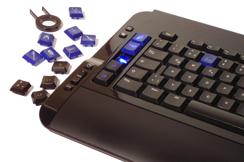 Nachdem der Treiber initialisiert ist, kann man an die Programmierung der Tastatur gehen. Zunächst steht man vor einer recht großen Funktionsvielfalt. Am schnellsten belegen lassen sich die Hotkeys neben dem Tastaturfeld. Im Treiber sind sie mit ‚Makrotasten’ überschrieben. Man kann ihnen entweder Makros zuweisen oder sie mit dem Aufruf en einer Anwendung versehen. Die Zuweisung von Makros ist für Spiele durchaus sinnvoll, wenn man etwa in RPGs eine bestimmte Abfolge benötigt, um etwa einen Zauberspruch zu wirken. Zudem kann die Verzögerung der Makrotasten eingestellt werden. Auch die einzelnen Tasten des Keyboards lassen sich frei belegen. Man kann also jede beliebige Taste gegen eine andere ersetzen. Was das im Desktopbetrieb bringen soll, ist allerdings unklar, da man hier kaum die Tasten umstellen wird. Interessant wird diese Funktion erst dann, wenn man für die jeweiligen Spiele ein Profil anlegt.