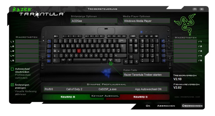 Die programmierbaren Profile sind allerdings eine Sache, die uns wirklich gefallen hat. Zwar ist die Programmierung eines Profils zu Beginn nicht ganz einfach, aber wenn man verstanden hat, wie es funktioniert, ist diese Funktion äußerst brauchbar. Ein frei programmierbares Profil bei der Tarantula besteht prinzipiell aus zwei sog. ‚Keysets’. Das bedeutet, dass man pro Profil zwei verschiedene Tastenbelegungen zuweisen kann. Man kann also etwa eine Belegung für den Desktop-Betrieb zuweisen und die zweite Belegung auf ein Spiel zuschneiden. Wechseln kann man diese Profile in vier Weisen: über die ‚Profile’-Taste oben am Keyboard, per Mausklick im Treiber, über die Programmierung einer Makrotaste und über das gleichzeitige Drücken einer F- und der Profile-Taste. In letzterem Fall werden allerdings nur die ersten 12 Profile aufgerufen. Grafisch angezeigt wird der Wechsel auf zweifache Weise: Man kann sich den Wechsel mit einer Bildschirmanzeige bestätigen lassen und zugleich blinkt das Razer-Logo auf der Tastatur zur Bestätigung mehrmals. Um die Profile zu laden, hat man zwei Möglichkeiten: Entweder, man wählt sie aus dem Drop-Down-Menü des Treibers aus und lädt sie manuell oder man erstellt sie so, dass beim Aufruf eines Spiels das gewünschte Profil automatisch geladen wird. Dazu muss man bei der Programmierung eines Profils eine Anwendung in Form einer .exe-Datei zuweisen. In unserem Fall haben wir Call of Duty 2 zugewiesen und es als Profil Nr. 6 abgespeichert. Dabei hatten wir Keyset 1 als Standardbelegung angelegt und in Keyset 2 einige Tasten geändert, die speziell für das Spiel zugeschnitten waren. Nach dem Aufruf des Spiels wurde das Profil problemlos automatisch geladen und war verfügbar. Mittels der Profile-Taste kann das Keyset auch während des Spiels umgeschaltet werden. Der Sinn dieser Maßnahme: Man kann, etwa wenn man Chat-Phrasen eingeben möchte, trotz laufendem Spiel auf die Standardbelegung zurückgreifen. Nach dem Beenden des Spiels ging die Tastatur automatisch auf unser Standard-Desktopprofil zurück, in unserem Fall die Nr. 1. Selbstverständlich lassen sich in die Profile auch die Makro- und Funktionstasten integrieren.