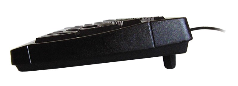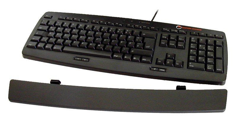 Die Beleuchtung der K2 fällt für eine Gaming-Tastatur ausgesprochen mager aus. So sind lediglich die drei üblichen Statuslampen vorhanden, die Auskunft über die Umschaltaste und den Ziffernblock geben. Hier wird auch die momentan gewählte Betriebsart Standard oder Game-Mode angezeigt. Weitere Beleuchtungselemente finden sich nicht. Die K2 lässt sich im Unterschied zur CyMotion mit einer optionalen Handballenablage versehen, die an der Fronseite der Tastatur angebracht werden kann. Hier finden wir eine deutlich solidere Lösung als bei der Microsoft Reclusa. So hat man zur Aufhängung der Ablage keine dünnen Nasen verwendet, sondern man setzt auf eine durchgehende Clip-Halterung, die in die Unterseite der Tastatur einrastet. Zwar klappt die Ablage beim Anheben der Tastatur ähnlich der Reclusa ebenfalls nach unten weg, aber durch die höchst solide Machart sind hier keine Pannen zu befürchten. Darüber hinaus bietet die Raptor zwei ausklappbare Standfüße, die das Niveau der Tastatur um knapp 12 mm anheben. Dadurch steht sie aber bereits recht steil, so dass man hier ausprobieren muss, ob einem das liegt.