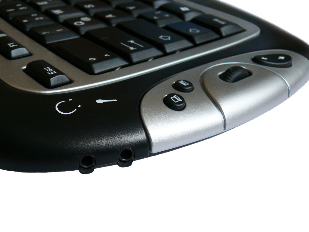 Die Tastatur verfügt über eine große Zahl von Sondertasten, die den Alltag erleichtern sollen. Diese funktionieren allesamt ohne zusätzliche Treibersoftware unter Windows Vista sowie unter Windows XP und lassen sich leider nicht frei konfigurieren. Laut Hersteller wird zudem Windows 2000 unterstätzt. An der linken Seite befindet sich ein Scrollrad, das den Griff zur Maus weniger häufig nötig machen soll. Darunter ist eine Wipptaste, die die gleiche Funktion wie die Bild-auf- und Bild-ab-Tasten besitzt. Eine weitere Taste dieser Gruppe öffnet den Arbeitsplatz, die letzte den oft verwendeten Windows-Rechner. An der Oberseite der Tastatur befinden sich neben der Tastengruppe für die Mediaplayer-Steuerung (von links nach rechts: Mediaplayer starten, vorherige Datei der Wiedergabeliste, Pause/Play, nächste Datei der Wiedergabeliste, Stopp) auch Tasten für die Aktivierung des Ruhezustandes des Rechners, Vor und Zurück, eine Abbrechen-Taste, Tasten zur Lautstärkeregelung sowie Stummschaltung, Tasten zum Starten des Standardbrowsers, des Standard-E-Mailprogramms, der Windows Suchfunktion, der Favoriten des Internet Explorers und zu guter Letzt eine Aktualisierungstaste. Der Sinn einiger dieser Sondertasten wie zum Beispiel Aktualisieren oder Abbrechen erschließt sich uns zwar nicht ganz, wird aber vielleicht trotzdem Anwender finden. Immerhin sind diese Funktionen ja bereits durch drücken von F5 oder Escape verfügbar.