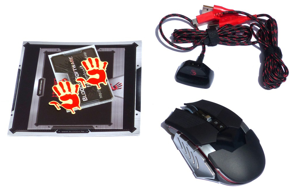 Von der Bloody RT5 gibt es wieder zwei Versionen. Bei der einen ohne Zusatz sind die zusätzlichen Software-Features Ultra Core 3 und 4 nicht freigeschaltet. Diese können allerdings bei Bedarf nachgekauft werden. Bei der aktivierten, der RT5A, sind diese Funktionen bereits beim Kauf aktiv. Später werden wir näher auf diese Features eingehen. Die Verpackung ist aus Karton im typischen rotschwarzen Bloody-Look und mit reichlich Feature-Text versehen. Die Front ist aufklappbar und macht es möglich, einen Blick auf die Maus zu werfen und grob die Konturen zu ertasten. Obwohl die Maus auf den ersten Blick relativ symmetrisch wirkt, handelt es sich um ein Rechtshänderdesign. Zum Lieferumfang gehören neben dem kleinen USB-Empfänger auch ein Micro-USB-Ladekabel, eine USB-Verlängerung, eine Kurzanleitung, zwei Bloody-Aufkleber und eine Produktbroschüre. Die etwa 20 MB große Installationsdatei der Bloody-5-Software muss aus dem Internet heruntergeladen werden. Der Lieferumfang wirkt nicht nur auf den ersten Blick üppig: