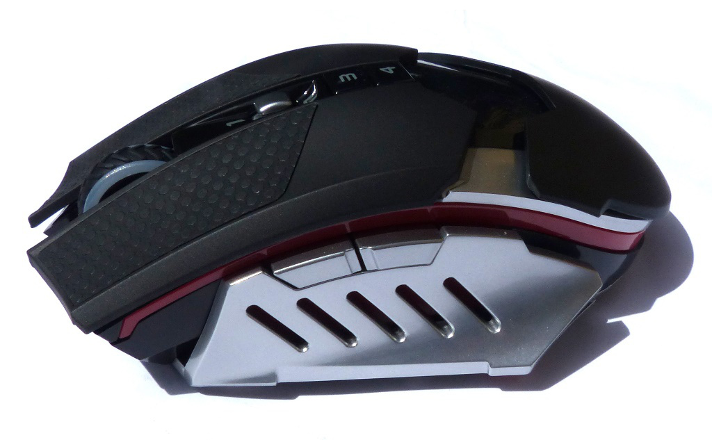 Das Gehäuse der Maus ist in Kunststoff gehalten, die Haupttasten sind leicht konkav und haben eine Noppenstruktur. Die Oberseite hat zwar eine angenehm weiche Struktur, doch die nicht perfekt eingepasste, leicht gummierte Oberfläche der Noppen sind einen Tick weniger angenehm. Bei den Haupttasten fällt zudem auf, dass vor allem die linke einen relativ großen Spielraum hat und sich auch ohne einen Klick auszulösen in alle Richtungen ein Stück bewegen kann. Dabei hört man unverkennbar das Geräusch einer sich bewegenden Feder. Auch dieses Faktum trübt das Bild der Maus ein wenig. Zusätzlich zu den zwei Haupttasten und dem Mausrad beitet die Maus noch sechs weitere Tasten. Zwei davon sind Daumentasten, wieder mit relativ großem Spielraum, zwei weitere Tasten und eine Wippe befinden sich hinter dem Mausrad. Vor allem die Hinterste ist wie üblich relativ schwer erreichbar ohne die Hand von der Maus zu lösen. Die Material- und Designwahl an den Seiten ist suboptimal. Es sammeln sich, vor allem in den vorhandenen Schlitzen, vermehrt Ablagerungen an.