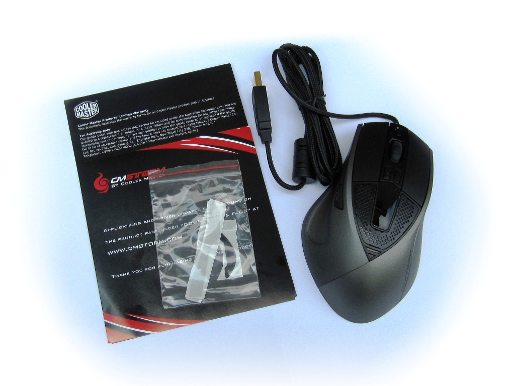 Die Verpackung der Maus ist eher unauffällig, Schwarz und Rot dominieren. Die Features werden auf der Vorder- und der Rückseite angepriesen, was eine lange Liste zur Folge hat. Ein aufklappbares Cover macht es möglich, einen Blick auf die Rechtshändermaus zu werfen. Neben der Maus liegen nur ein Garantiehinweis und ein zweites Set Mausfüße bei. Eine Software-CD sucht man vergebens. Diese muss aus dem Internet heruntergeladen werden. In der Maus befinden sich 5 Gewichte à 4,5 Gramm, welche ein Anpassen der Masse im hinteren Teil der Maus erlauben. Damit werden Spieler unabhängig von ihren Vorlieben bedient.