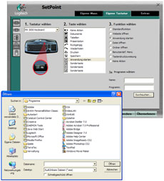 Die SetPoint-Software ist schon seit vielen Generationen verschiedener Logitech-Eingabegeräte ein Begriff und kommt aktuell in Version 2.4 daher. Die Funktionen und möglichen Einstellungen für Maus und Tastatur sind sich dabei sehr ähnlich und umfassen beispielsweise das Ändern der Belegung der "F Mode"-Tasten der Tastatur oder das komplette Abändern der Multimediatasten. Wer zum Beispiel nicht den Windows Media Player mit der MEDIA-Taste starten möchte, kann hier gerne eine externe Applikation ins Spiel bringen und etwa den VLC Media Player zu seinem Standardplayer machen. Ein weiteres spezielles Feature der Tastatur ist das Verschlüsseln der Übertragung, so dass nach ein paar kurzen Schritten der Einrichtung die Übertragung zwischen Funktstation und MX 3000 Cordless Tastatur sicher ist. Neben dem Variieren der Tastenbelegung bietet die MX 600 Lasermaus den so genannten "Spiele-Modus", welcher diverse Einstellung rund um Bewegung, Beschleunigung und weitere Themen bereithält. Alles in Allem eine zufriedenstellende Software, auch wenn sie im Umfang den GyroTools (siehe vorherige Seite) bei weitem nicht das Wasser reichen kann.