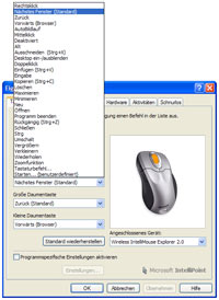 Ähnlich wie SetPoint bei Logitech, sind auch die Applikationen IntelliPoint (für Maus) und IntelliType (für Tastatur) seit Jahren ein fester Bestandteil des Lieferumfangs von Retail-Eingabegeräte aus dem Hause Microsoft. So ermöglicht IntelliPoint beispielsweise das flexible und nahezu freie Belegen aller Steuerelemente der Wireless IntelliMouse Explorer 2.0 - neben einer großen Auswahl an fertigen Befehlen, steht auch das Starten beliebiger Programme per Tastendruck zur Verfügung. Die getätigten Einstellungen lassen sich dabei sowohl global auf das gesamte Betriebssytem und gestartete Applikationen anwenden, als auch Programmspezifisch einsetzen. So kann zum Beispiel allgemein das Mausrad zum Scrollen nutzen und in einem gewünschten Programm die Zoom-Funktion zuweisen. Ein weiterer Menüpunkt von IntelliPoint gibt Informationen über die Signalqualität der Funkverbindung und den aktuellen Status der Batterien zurück.