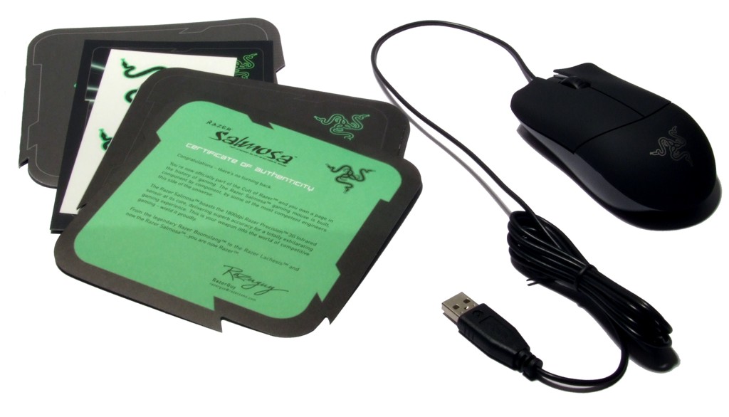 Der erste Eindruck der Razer Salmosa lautet schlicht. War man von den bisherigen Razer-Mäusen üppige Gummileisten oder Zusatztasten und anderes gewohnt, so hat man mit der Salmosa eine auf den ersten Blick sehr einfache Maus vor sich. Mehr als zwei große Haupttasten und ein Rad bietet sie nicht – doch das ist absolut im Sinne des Herstellers, der explizit darauf verweist, dass es sich bei der Salmosa um eine Gaming-Maus für Einsteiger handelt. Auch der restliche Lieferumfang fällt nicht sehr üppig aus, aber das kennt man von anderen Razer-Produkten nicht anders. Der geneigte Käufer bekommt v.a. eines: Viel Papier in Form einer Kurzanleitung, eines Echheitszertifikates und einiger Aufkleber. Zudem ist noch eine Treiber-CD beigelegt, die die nötige Software enthält.