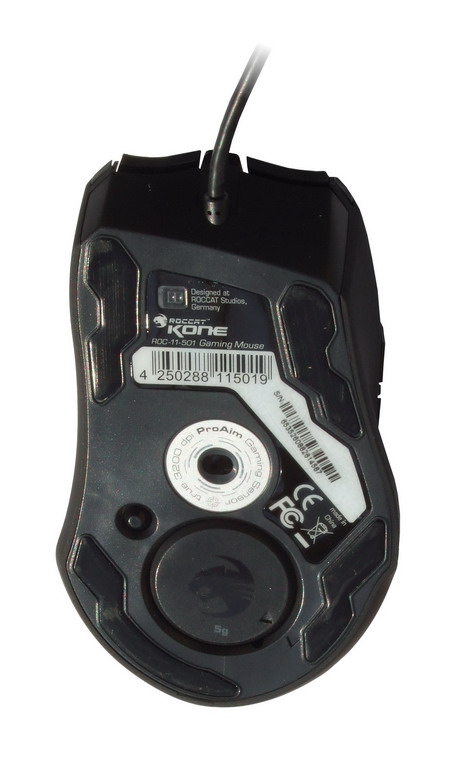 Dreht man die Maus um, so fallen mehrere Dinge auf: Neben dem Lasersensor beherbergt der Boden die Optik für die TCU (Tracking Control Unit). Sinn der TCU ist, dass man die Maus auf verschiedenen Mauspads kalibrieren kann, um eine optimale Abtastung zu erreichen. Dabei wird die Leistung des Lasers automatisch der Oberfläche angepasst. Das ist ein bisher einzigartiges Feature bei einer Maus. Zudem verfügt die Kone über eine Abstandsmessung zur Oberfläche, um das unbeabsichtige Wandern des Mauszeigers beim Umsetzen zu minimieren. Auf der Unterseite lassen sich auch verschiedene Gewichte einsetzen, die per Drehung fixiert werden. Der Clou dabei: Die Kone erkennt automatisch, welches Gewicht verbaut ist und zeigt das im Treiber an. Das Gewicht lässt sich durch Druck auf den kleinen Knopf neben dem Gewichtsschacht wieder lösen. Die asymmetrisch gehaltenen Teflongleiter sitzen um den Rand des Bodens herum verteilt. Roccat verwendet hier relativ großflächige Gleiter, die aber dennoch kleiner ausfallen als etwa bei Logitech. Der Gleitfreudigkeit tut das aber keinen Abbruch.