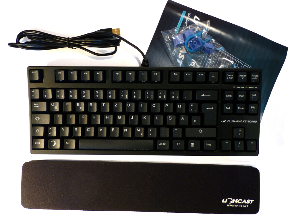 Doch auch eine kleine, unauffällige Tastatur kann technisch sehr komplex sein. Die Tasten haben eine angenehme Oberfläche und fühlen sich hochwertig an. Die Beschriftung ist klar lesbar, die Funktionstasten sind für die Alternativfunktionen vorne beschriftet. WASD-Tasten und Pfeiltasten heben sich wegen der blauen Beleuchtung leicht von den anderen Tasten ab, die Beschriftung ist hier ausgespart. Die Tasten können durch beiliegende, blaue Tasten ersetzt werden, um sie besser von den anderen Tasten abzuheben. Die schlichte Handballenauflage besteht aus einem mit Stoff überzogenen Schaumstoff, der die ganze Tastaturbreite ausfüllt und angenehm weich ist. Ob sie auch auf längere Sicht haltbar ist, wird sich erst erweisen müssen. Die Neigung der LK20 kann mit aufklappbaren Tastaturfüßen geändert werden. Die Tastatur hat keine Makrotasten, sondern lediglich ein paar Alternativfunktionen, wodurch beispielsweise die Multimediasteuerung realisiert wird. Die alternativen Funktionen werden mittels gleichzeitigen Druckes auf die Fn-Taste ausgelöst, welche die rechte Windowstaste ersetzt. Abgesehen davon und vom fehlenden Nummernblock, hat sich Lioncast sonst an das Standardlayout gehalten. Auf Wunsch kann auch die verbliebene Windowstaste deaktiviert werden. Auch die Beleuchtung wird mittels der Funktionstaste angepasst. Der WASD-Bereich und die Pfeiltasten können dezent blau beleuchtet werden. Es stehen drei Helligkeitsstufen und ein pulsierender Modus zur Verfügung.