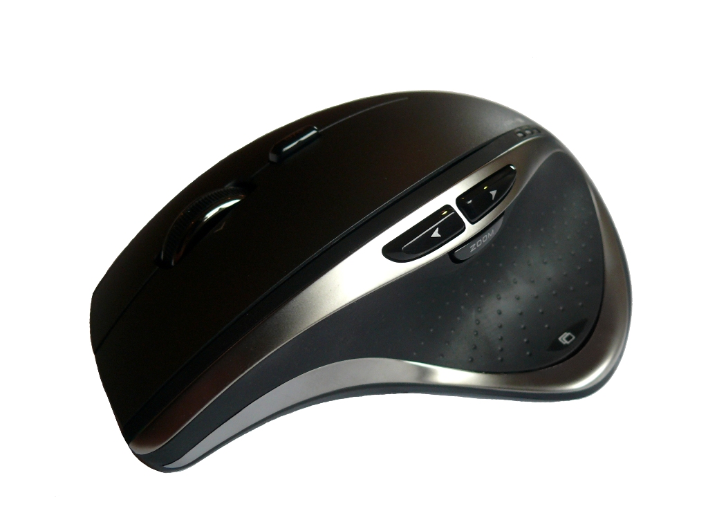 An der Oberseite der Maus befinden sich, abgesehen von dem bereits erwähnten MicroGear-Scrollrad noch die zwei üblichen Maustasten und der Umschalter für die zwei Modi des Scrollrads. Damit lässt sich das Rad zwischen stufenweisem und stufenlosem Drehen einstellen. Im Free-Spin-Modus dreht sich das Mausrad wieder etwa 10 Sekunden, kann aber jederzeit gestoppt werden. Außerdem befinden sich drei LEDs an der Oberseite, welche von Zeit zu Zeit den aktuellen Füllstand des Akkus anzeigen. Außerdem lässt erkennen, in welchem dpi-Modus die Maus gerade läuft, wenn man hierfür eine Taste gesondert belegt. Hier vermissen wir leider extra Tasten zum Umschalten der Auflösung der Maus, wie wir sie bei der MX 1100 kennengelernt haben. An der linken Seite befinden sich vier Daumentasten. Die Taste für die Programmumschaltung befindet sich, wie wir es schon von der MX 1100 kennen, versteckt unter der Daumenauflage. Weiters finden wir an der Seite die üblichen Vor- und Zurücktasten und eine Zoom-Taste.