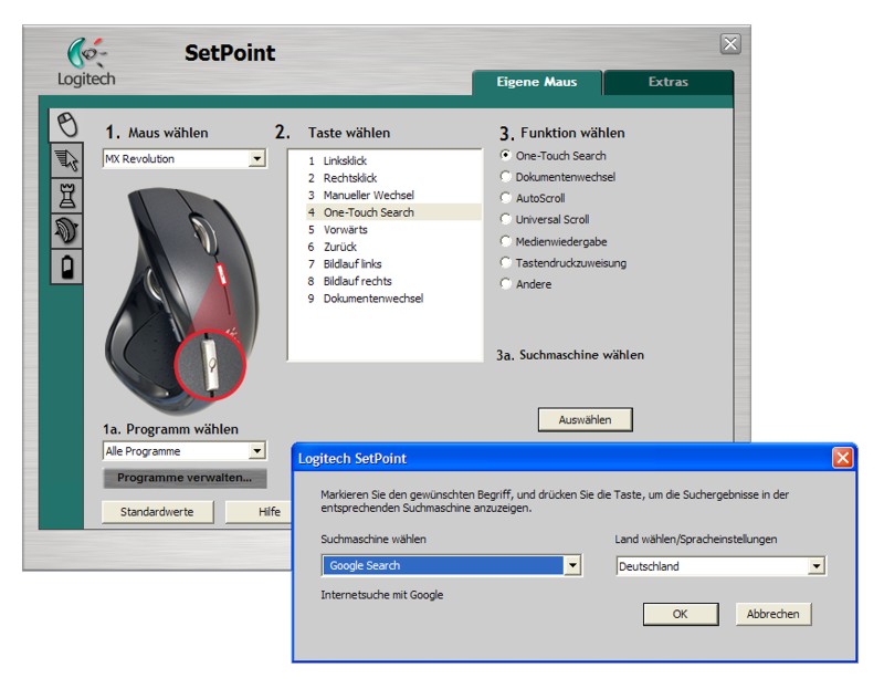 Für unseren Test haben wir die aktuellste Version des hinlänglich bekannten SetPoint-Treibers von Logitech verwendet. Zum Zeitpunkt des Tests war das die Version 3.01, die auch auf CD mitgeliefert wird. Hier gab es weder Probleme mit dem Setup noch hatte die Software irgendwelche Schwierigkeiten, die Maus zu erkennen. SetPoint bietet alles, was man zur Konfiguration der Maus benötigt.
