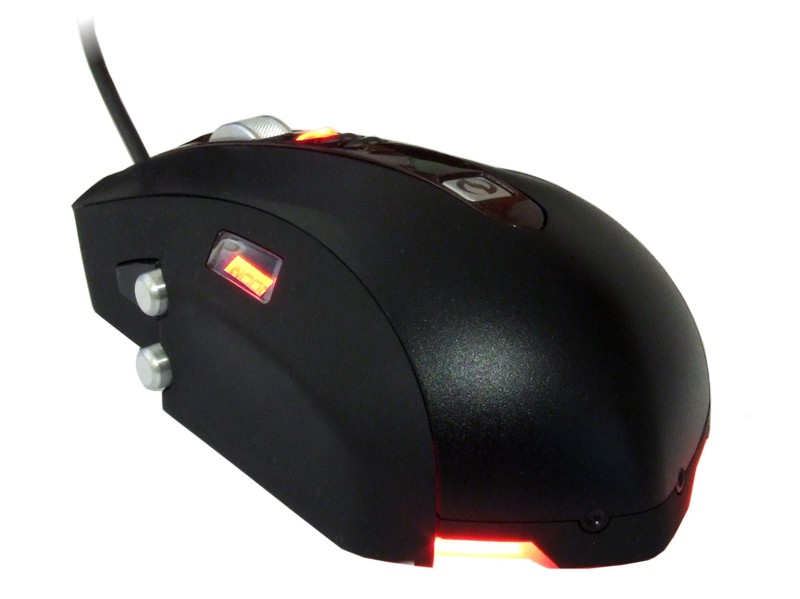 Die beiden gut funktionierenden Haupttasten flankieren einen dunkelrot abgesetzten Mittelbalken, auf dem die drei Tasten für die dpi-Verstellung, das Mausrad sowie die Schnellstart-Taste angeordnet sind. Letztere ist durch das prägnante SideWinder-Logo gekennzeichnet und ruft das Treibermenü auf. Die Verstellung des dpi-Wertes kann den dpi-Tasten im Treiber zugewiesen werden. Dabei ist es möglich, Intervalle von 100 dpi im jeweiligen Bereich festzulegen. Die gewählte Auflösung wird auf zwei Wege signalisiert: Zum Einen ist die Taste mit der jeweils gewählten Auflösung beleuchtet, zum Anderen wird die Auflösung in einem kleinen Display auf der linken Seite der Maus angezeigt. Die Auflösung wird eingeblendet, wenn man eine der dpi-Tasten betätigt oder die aktuell gewählte Einstellung nochmals drückt. Das ist schön gelöst, denn so hat man jederzeit den Überblick, welche Einstellung angewählt ist. Das Rad wiederum besteht ebenfalls aus Aluminium und fungiert als dritte Taste. Bei einem Klick auf das Rad wird die Schnellscroll-Funktion aktiviert. Dabei fühlt sich das Rad vergleichbar dem der Logitech Revolution an, allerdings ohne die aufwändige Mechanik. Allerdings könnten die Raststufen etwas definierter sein, aber dennoch gewöhnt man sich schnell daran.
