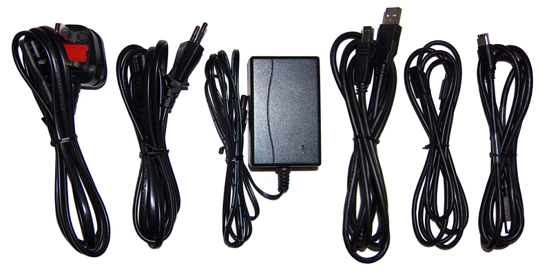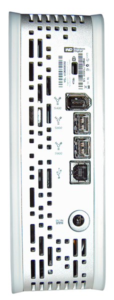 Anschlussseitig kann die Pro Edition mit USB2.0, FireWire 400 und FireWire 800 punkten, deren Anschlüsse auch hier an der Rückseite neben dem Kensington Lock und dem Stromanschluss für das externe Netzteil angebracht wurden. Als Anschlusskabel kommt ebenfalls das schon von der Premium ES bekannte, 3,2 m lange zweigeteilte Kabel daher und auch hier wurde wieder ein Stecker-Typ G beigelegt, mit dem man in Ländern wie Großbritannien, Irland, Singapur oder Malaysia immer eine passende Steckdose finden sollte. Die My Book Pro genehmigt sich, wenn sie mit einer Stromquelle verbunden ist, dauerhaft 2,3 Watt, weswegen man sie bei längerem Nichtgebrauch komplett vom Netz trennen sollte. Zusätzlich verfügt sie aber über eine Art Stromsparmodus, der es ihr ermöglicht, die fast 13 Watt im Idle nach 10minütiger Inaktivität der externen Festplatte auf 4,1 Watt zu reduzieren, in dem der Datenträger einfach abgeschaltet wird, die Controlleinheit jedoch aktiv bleibt. Dieser Zustand ist äußerlich nicht vom normalen Wartezustand zu unterscheiden, denn auch hier leuchten alle LEDs konstant; sobald jedoch auf die My Book Pro zugegriffen werden sollte, läuft sie wahrnehmbar wieder an und steht nach nur kurzer Zeit zur Verfügung. Die mitgelieferten USB (A-B)-, FireWire 400- und FireWire 800-Kabel kommen hier sogar mit 1,8 m Leitungslänge daher und somit stellt die Western Digital My Book Pro zusammen mit der Maxtor OneTouch III die längsten Datenverbindungskabel aller Probanden im Testfeld.