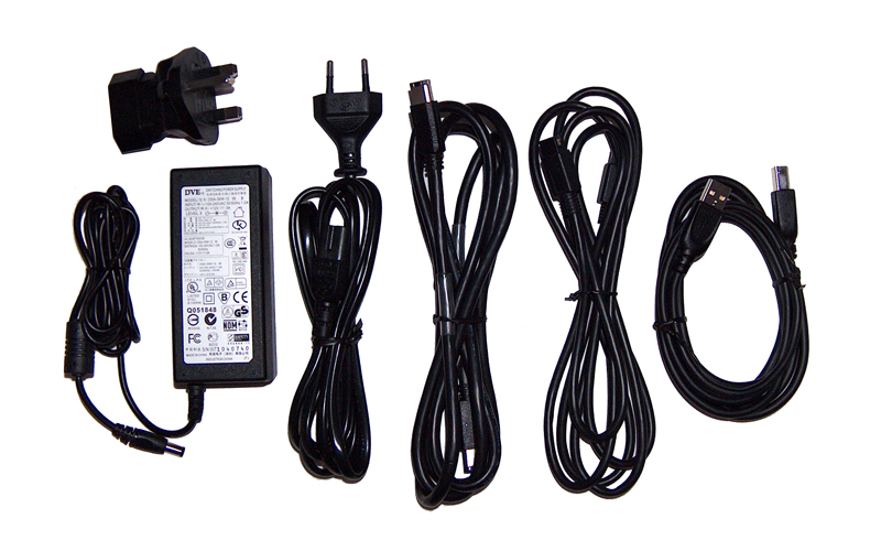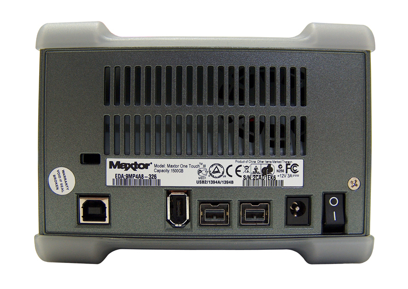 Verbindungsseitig kann man hier das volle Repertoire auskosten, welches USB2.0, FireWire400 und auch FireWire800 umfasst. Finden lassen sich sämtliche Anschlüsse wieder auf der Rückseite, wo auch der Ein-/Ausschalter und der Stromanschluss für das externe Netzteil angeordnet sind. Das Netzgerät, hier wieder zweiteilig gehalten, kann mit einer maximalen Kabellänge von stolzen 3,75 m punkten und auch hier wird ein Stecker-Typ G mitgeliefert, welcher an dieser Stelle allerdings einen reinen Adapter vom Stecker- Typ C (CEE 7/16, Eurostecker) auf G darstellt. Ob aber nun als Kabel direkt zum Netzteil oder als Adapter auf bestehende Steckertypen, wichtig ist im Endeffekt die Nutzung im Ausland, die solche Geräte gleich von Haus aus mit sich bringen und im vorliegenden Falle der Maxtor OneTouch III eine Nutzung in Ländern wie Großbritannien, Irland, Singapur oder Malaysia ohne Zusatzgerätschaften ermöglichen. Die ebenfalls mitgelieferten USB (A-B)-, FireWire 400- und FireWire 800-Kabel kommen lobenswerterweise mit je 1,8 m Länge daher.