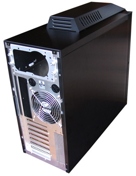 Beim Lian Li PC-P60 Armorsuit aus gebürstetem Aluminium und schwarzer Lackierung handelt es sich um ein herkömmliches ATX-Gehäuse, das auf eine traditionelle Anordnung der Komponenten setzt. Für die Installation der Hardware stehen dem Benutzer, bei Vernachlässigung der nach Hinten hinausstehenden Schrauben, 211 x 495 x 541 mm (B x H x T) an Volumen zur Verfügung. Besonders auffällig ist dabei der obere Aufsatz, der einen weiteren 140 mm Blue LED Lüfter (bläst Warmluft nach außen) beherbergt und zudem verschiedene Anschlüsse bietet. Dazu gehören ein eSATA-Anschluss für externe Festplatten, ein 6-Pin FireWire-Anschluss, vier USB 2.0-Anschlüsse und die obligatorischen Audio-Ports für den Anschluss eines Kopfhörers (jeweils 3,5 mm Klinke). Abgeschlossen wird der Front-Panel-Bereich durch eine kleine Alu-Schutzklappe mit "Lian Li"-Aufschrift. Direkt dahinter und dadurch ebenfalls hervorragend zu erreichen, falls der PC auf dem Boden steht, der Power- bzw. der Reset-Button - beide aus Aluminium.