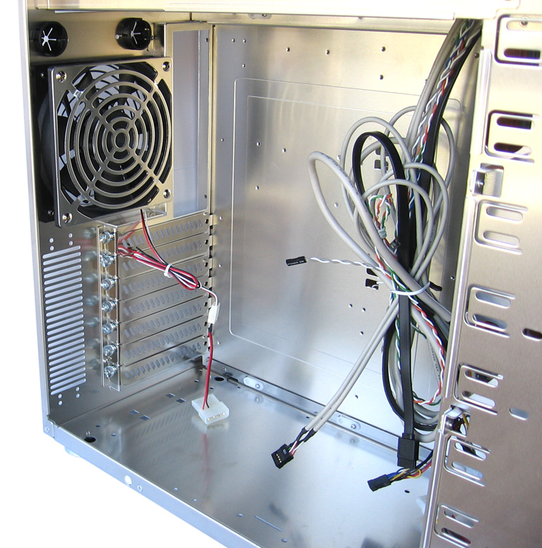 Das Innere des Lian Li PC-P60 Armorsuit bietet auf den ersten Blick keine Besonderheiten, da man auf das bewährte und klassische ATX-Design bei der Anordnung der Komponenten gesetzt hat. Die wichtigsten Eckpunkte sind dabei das Netzteil im oberen Bereich, das Mainboard in üblicher Position und die Laufwerke in 3,5 und 5,25 Zoll Ausführung im vorderen Bereich des P60. Bei der Installation von Laufwerken und sonstigen Front-Modulen lässt einem Lian Li möglichst freie Hand, da der Festplattenkäfig in seiner Einbauhöhe variiert werden kann. Dazu wurden die insgesamt neun 5,25 Zoll Schächte in drei Bereiche zu jeweils drei Montageplätzen aufgeteilt. Dadurch hat der Benutzer die Möglichkeit die Festplatten (maximal drei 3,5 Zoll Laufwerke) ganz oben, in der Mitte oder ganz unten im Gehäuse zu montieren. Dies kann sich vor allem dann als praktisch erweisen, wenn man beispielsweise den PC auf dem Schreibtisch stehen hat und die optischen Laufwerke aus Gründen der besseren Erreichbarkeit nicht wie üblich oben, sondern unten im Gehäuse installiert werden sollen. Alles in Allem stehen somit entweder neun (falls der Festplattenkäfig nicht benutzt wird) oder sechs 5,25 Zoll und bis zu drei 3,5 Zoll Schächte für die Montage von entsprechenden Komponenten bereit. Wie bereits auf der vorherigen Seite erwähnt, bietet das Lian Li PC-P60 Armorsuit leider keine Möglichkeit externe 3,5 Zoll Laufwerke zu verbauen.