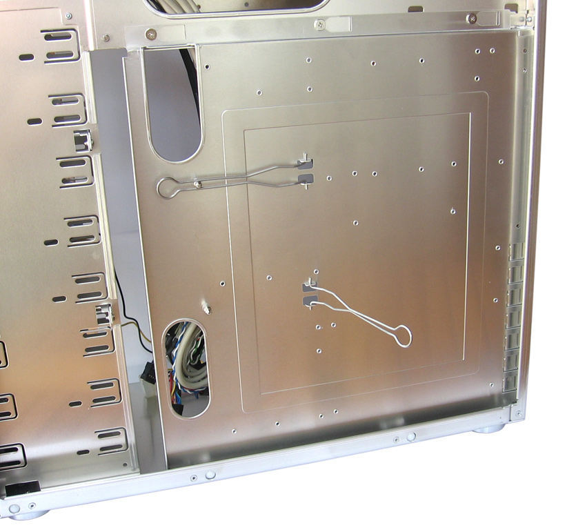 Der nächste Arbeitsschritt sieht die Installation des Netzteils vor. Hierzu wird der Netzteilrahmen, der mit vier Rändelschrauben befestigt ist, vom Gehäuse gelöst und mit dem gewünschten ATX-Netzteil verschraubt. Anschließend kann das Netzteil samt Kabel von Außen in das Gehäuse eingeführt und wiederum durch die vier Rändelschrauben fixiert werden. Nun nehmen wir den bisher noch unbestückten Mainboardschlitten heraus und montieren das Mainboard. Zu diesem Zweck wird die Seitenwand des Armorsuit abgenommen und die beiden Rändelschrauben an der Gehäuserückseite werden gelöst. Nachdem der Schlitten leicht (etwa 1 cm) nach vorne (Richtung Front) geschoben wurde, lässt er sich seitlich herausklappen. Nachdem das zum Board gehörende ATX-I/O-Shield an der Rückwand installiert wurde, kann der Schlitten wieder in das System eingebaut und vorsichtig in das I/O-Shield geschoben werden. Mit dem Festziehen der Rändelschrauben ist das Mainboard damit fertig montiert und es können mit den Klammern auf der Rückseite des Mainboardschlittens noch lästige Kabel gebändigt werden.