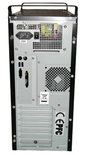 Die Frontpartie ist mit zwei gut erreichbaren USB-Anschlüssen sowie einem Soundein- und –ausgang ausgestattet. Optional ist hier noch ein FireWire-Anschluss vorgesehen, der in unserer Variante allerdings nicht vorhanden war. Weiter finden wir jeweils eine LED für den Betriebszustand des Rechners und die Festplattenaktivität. Hier hat man sich seitens Codegen für die Farben Rot und Gelb entschieden – eine Abweichung vom mittlerweile oft anzutreffenden Blau.