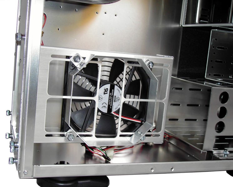 Somit geht Lian Li mit dem PC-6070 Plus II einen dritten Weg: Man versucht, die Möglichkeiten zur Kühlung, die der ATX-Standard bietet, maximal zu nutzen. Üblicherweise sieht das ATX-Konzept vor, dass kalte Luft vorne am Gehäuse eingesaugt wird und die Komponenten kühlt, um anschließend nach hinten und oben abgeführt zu werden, weil warme Luft bekanntlich aufsteigt. Hier setzt Lian Li an, indem man die Verhältnisse gewissermaßen umkehrt. So wird zwar nach wie vor ein Teil der kalten Luft vorne angesaugt, aber diese wird nur zur Kühlung der Festplatten und der Grafikkarten verwendet. Die so erwärmte Luft wird über einen 120 mm-Lüfter in Höhe der Grafikkarten abgesaugt und nach außen geführt.