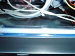 Hier kommen wir nun endlich zu der genialen blauen Kaltlicht Kathode, die oben drauf noch soundsensitiv ist. Das heist, wenn man Musik hört oder die Festplatte laut genug ist, blinkt die Kaltlicht Kathode auf, was einen wirklich genialen Effekt ergibt! Diese soundsensitiv Funktion kann man aber auch abstellen, gerade für eher ruhigere Momente wo man doch lieber nur einen schonen blau beleuchteten PC möchte. Wir haben hier noch ein kleines Video aufgenommen, in welchem sie die Kathode in Aktion sehen (Video). Da die Kaltlicht Kathode nicht das einigste Extra ist, kommen wir hier nun zum mitgelieferten Gehäuselüfter...