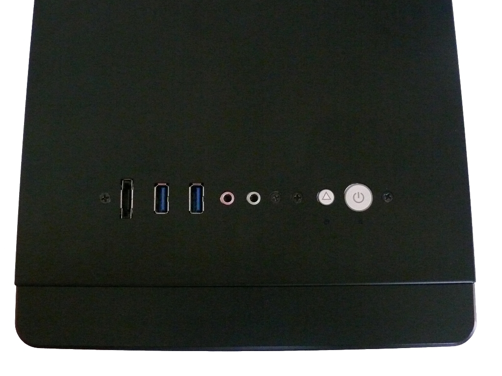 An der Oberseite des Gehäuses befindet vorne, nebst dem Power- und dem Reset-Taster, ein eSATA-Anschluss, die Audio-Ports (2 x 3,5 mm Klinke) sowie eine Besonderheit des Gehäuses, zwei Front-USB des Standards 3.0. Da die Lian Li-übliche Abdeckung in der neuen Serie nicht mehr vorhanden ist, kann gegebenenfalls Staub in die Anschlüsse eindringen. Für viele ältere Lian Li Gehäuse gibt es allerdings Front-Panels mit USB 3.0 zum nachrüsten. Power- und Reset-Taster sind blau bzw. rot beleuchtet, wenn sie an den Pins der Status-LEDs befestigt werden. Weiter hinten befindet sich an der Oberseite eine Abdeckung, welche entfernt werden kann, um einen weiteren 140-mm-Lüfter zu montieren.