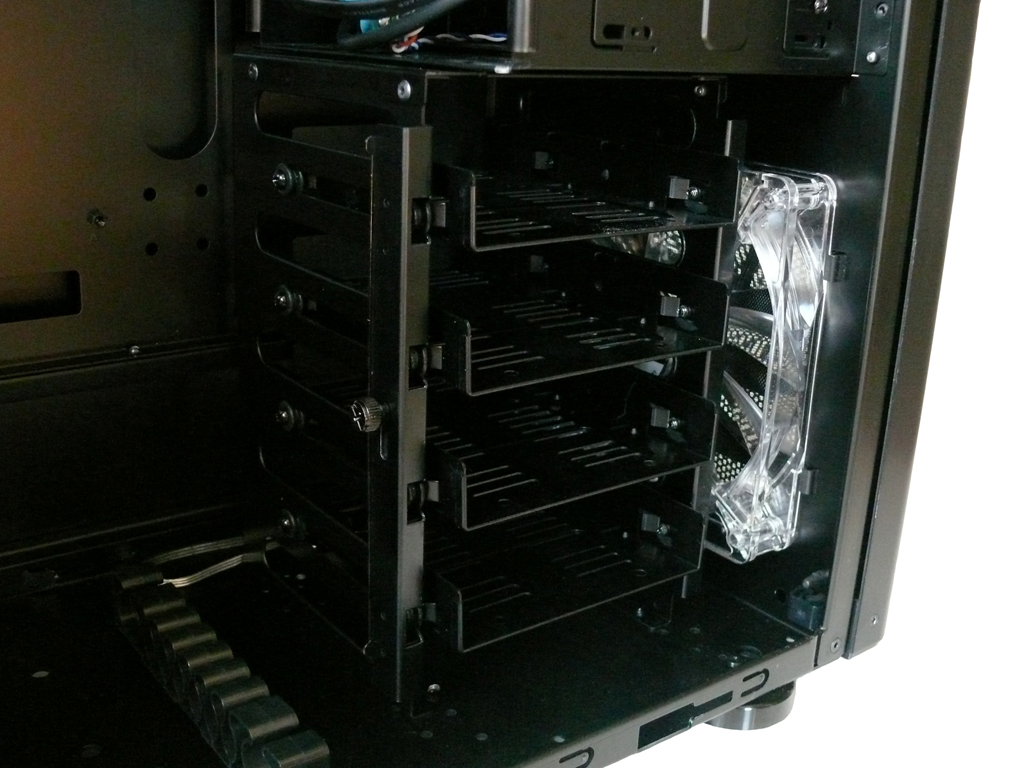 Die Festplatten werden in die dafür vorgesehenen Halterungen gesteckt und können schraubenlos fixiert werden. Auch 2,5"-Laufwerke können eingebaut werden. Danach werden die Festplatten mitsamt Halterung in den Käfig geschoben und gemeinsam mit einer Daumenschraube fixiert. Alle Festplatten sind durch ihre seitliche, gummierten Halterungen entkoppelt. Optional können alle Laufwerke auch verschraubt werden. Das Netzteil kann, wie bereits erwähnt, sowohl mit dem Lüfter nach oben als auch nach unten verschraubt werden. Im zweiten Fall saugt das Netzteil dann die durch den Staubfilter gefilterte Luft durch die Schlitze im Gehäuseboden. Auch hier wurde eine mögliche werkzeuglose Befestigung geschaffen, die mit einem mitgelieferten Haltebügel realisiert wird.