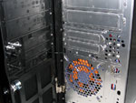 In Sachen Ausstattung hat das Gehäuse innerlich als auch äußerlich einiges zu bieten. So ist im Inneren ein seperater, herausnehmbarer Festplattenkäfig vorhanden, welcher Platz für bis zu fünf Festplatten bietet. Zudem liefert Thermaltake passend für diesen Käfig die enstprechenden "Daumenschrauben" mit, welche für eine einfache, werkzeuglose Montage der 3,5 Zoll Festplatten dienen. Eine Etage höher befinden sich zwei weitere 3,5 Zoll Einschübe, welche entweder für Diskettenlaufwerke oder noch zwei zusätzliche Festplatten genutzt werden können. Auch dieser Laufwerkskäfig lässt sich herausnehmen. Sehr positiv ist, dass bis auf die Mainboard-Montage kein Schraubendreher oder anderes Werkzeug benötigt wird, denn auch die Laufwerke lassen sich dank der mitgelieferten Führungsschienen schnell und einfach integrieren. Hinter der Frontpartie, welche sich in zwei Stufen öffnen lässt, verbirgt sich neben Power-Button, Reset-Knopf und Kontrollleuchten noch der auswechselbare Staubfilter, welcher für saubere Luft sorgt. Allerdings sammelt sich in dem Raum zwischen der Aluminium Frontklappe und den dahinter liegenden Laufwerken auch einiges an Staub auf der empfindlichen Oberfläche - so muss recht oft zum mitgelieferten Staubtuch gegriffen werden.
