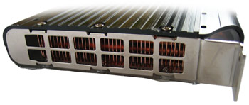 Auf den ersten Blick mag man gar nicht glauben, dass Hersteller Sapphire in gemeinsamer Entwicklung mit Kühlungsspezialist Thermaltake eine gesamte Wasserkühlung auf die Größe einer herkömmlichen Add-In-Karte geschrumpft hat, doch auch das nähere Hinsehen lässt keine Zweifel daran aufkommen. Die gesamte Konstruktion beherbergt einen Ausgleichsbehälter, eine 12V Mini-Pumpe und einen massiven Radiator - Installation via Slot-Bracket und PCI-kompatible Steckverbindung. Letzterer ist an die metallische Seite des Toxic-Gehäuses gekoppelt und erhält damit eine weitere Abfuhrmöglichkeit für die entwickelte Wärme. Inmitten des ganzen finden wir einen LED-Lüfter (Farbe: blau), der sich in zwei verschiedenen Stufen betreiben. Zwei Betriebsdrehzahlen ermöglichen wahlweise leiseren Betrieb oder höhere Leistung: 18 dBA bei 2000 U/Min bzw. 26 dBA bei 2500 U/Min. Als Redakteur und Anwender hätten wir uns an dieser Stelle eine stufenlose Regelung gewünscht - versierte Bastler und Hobby-Elektroniker können hier jedoch problemlos noch nachbessern und perönliche Vorlieben ins Spiel bringen.