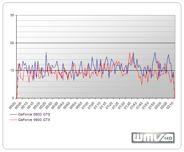 Betrachtet man die beiden Graphen im oberen Diagramm, so gestaltet sich der Verlauf der CPU-Auslastung bei beiden Probanden relativ gleichlaufend. Auffällig ist allerdings, dass die GeForce 9800 GTX eine knapp 2% höhere Auslastung der CPU verursacht.