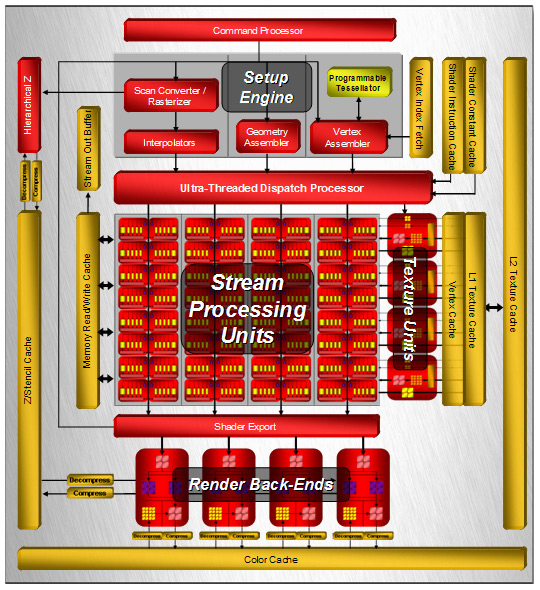 Der Trick an Unified-Shader ist dabei relativ leicht nachzuvollziehen. Herkömmliche Architekturen setzen auf verschiedene Arten von Shader-Prozessoren, die jeweils nur für eine Aufgabe bestimmt sind (zum Beispiel Vertex oder Pixel). Shader aus Unified-Shader-GPUs sind in der Lage alle anfallenden Arbeiten zu erledigen und somit auf keinen Typ festgelegt. Diese Einheiten nennt man Stream-Prozessoren und können im Falle der R600-Generation sowohl Vertex- und Pixel- als auch Geometry-Operationen ausführen. Je nach Modell können bis zu 320 dieser SPs integriert sein und superskalar in der Berechnung agieren. Dies heißt konkret, dass bis zu fünf Operationen pro Takt abgearbeitet werden können (bisher: zwei Ops/sec). Superskalar bedeutet dabei auch, dass eine dynamische Zuteilung der Operationen auf die Prozessoren besteht, um eine maximale Parallelität zu erreichen und das System maximal auslasten zu können. Da die Zuteilung eben nicht mehr direkt durch den Compiler vorgenommen wird, sondern während des Betriebs dynamisch geschieht, wird eine entsprechenden Zuteilungseinheit benötigt. Diese nennt sich im Fachschargon "Dispatcher" (Koordinator bzw. Zuteiler). In der zweiten Unified-Shader Generation von ATi hat man auch diese Einheit weiter verbessert und den "Ultra Threaded Dispatch Processor" geschaffen, der eine maximale Auslastung der zur Verfügung stehenden Stream-Prozessoren und somit höchstmögliche Berechnungsgeschwindigkeit erreichen soll.