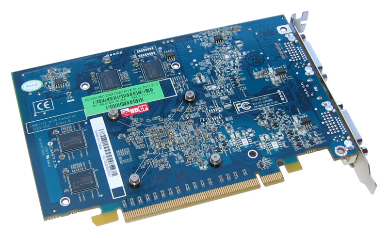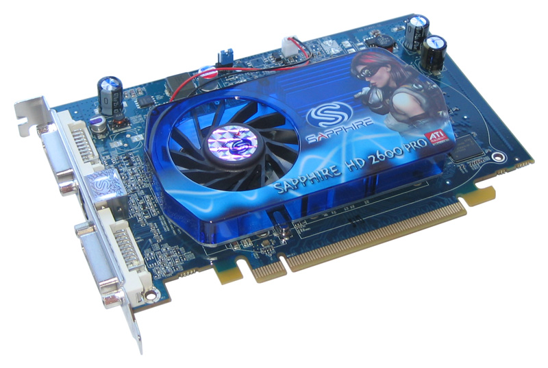 Seitens der Hardware setzt die HD 2600 Pro von Sapphire auf eine RV630 GPU, gefertigt in 65 nm. 24 5-dimensionale Shader-Einheiten sorgen wiederum für ausreichende Rechenpower sorgt (120 Stream-Prozessoren). Der Chiptakt entspricht dem Referenzdesign von ATi und liegt bei 600 MHz. Über ein 128 Bit breites Speicher-Interface werden die verbauten 256 MB DDR2-Speicher angebunden. Die DDR2-Chips stammen von Hersteller Qimonda, ein Tochterunternehmen von Infineon, und tragen die Seriennummer HYB18T256161BF-20. Dies bescheinigt gemäß der Datenblätter eine maximale Frequenz von 500 MHz bei 1,8 Volt Betriebsspannung (2,0 ns Latenz). Damit dürfte beim Overclocking kaum Luft nach oben sein, da im BIOS der Karte bereits eine Speicherfrequenz von 500 MHz hinterlegt und das theoretische Maximum somit erreicht ist. Für die Ausgabe der Bilddaten an den Monitor stehen zwei Dual-Link-DVI-Ports (bis 2560 x 1600 Pixel) und ein TV-Ausgang zur Verfügung. Mithilfe des mitgelieferten Adapters lässt sich auch ein analoges Gerät über den 15-poligen D-Sub anschließen.