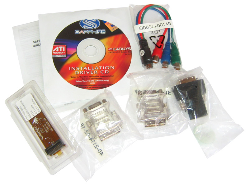 Für den Test stand uns eine Radeon HD 2600 XT aus dem Hause Sapphire zur Verfügung. Die Karte kommt als Ausführung mit GDDR4-Speicher daher und verfügt daher über einen höheren Speichertakt als die Versionen mit GDDR3-BGA-Chips - im Preis ergibt sich dadurch eine Differenz von etwa 30 Euro. Technische Details im folgenden Abschnitt. Des Weiteren hatten wir es mit der Lite-Retail-Edition zu tun, welche sich mit einem leicht abgespeckten Lieferumfang begnügen muss, aber dennoch alle wichtigen Komponenten mit sich führt. So finden wir neben einem Quick-Install-Guide zum Einbau und Setup der Grafikkarte auch eine Treiber-CD mit aktuellen Catalyst-Treibern von ATi. Mit dabei sind außerdem zwei DVI/VGA-Adapter zum Ansteuern analoger Monitore über die zwei digitalen Dual-Link-DVI Anschlüsse, ein DVI/HDMI-Adapter zur Nutzung der integrierten Wiedergabe-Features des R(V)6xx, die bekannte CrossFire-Bridge sowie ein RGB-Komponentenkabel für den TV-Ausgang der Platine. Nur bei Full Retail enthalten ist der Gutschein für "The Black Box" von Valve, die Anfang Oktober exklusiv für Käufer von Radeon HD 2000 Produkten erhältlich ist und drei Spiele enthält: Half-Life2: Episode 2, Portal und Team Fortress 2.