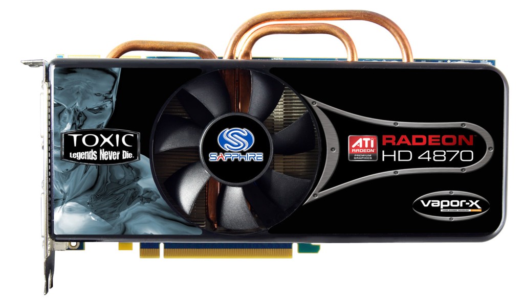 Vorder- und Rückseite der HD 4870 Toxic. Deutlich zu erkennen sind auch die beiden Bridge-Steckplätze für die CrossFireX-Funktion der HD 4870 sowie die Heatpipes des Vapor X-Chambers.