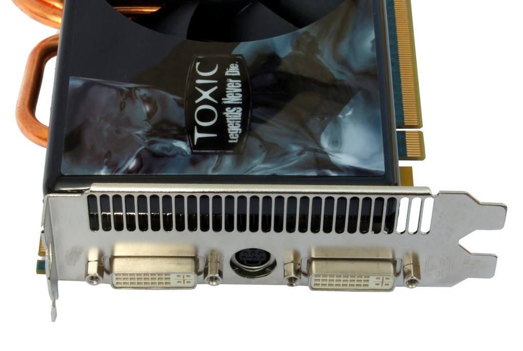 Die beiden PCI Express-Stromanschlüsse und die Slotblende der HD 4870 Toxic im Detail. Die Slotblende bietet zwei DVI-Ausgänge sowie einen S-Video-Ausgang. HDMI wird über einen beiliegenden DVI-Adapter realisiert.