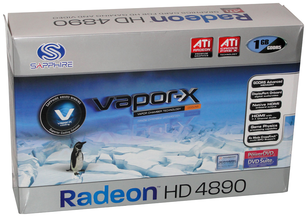 Die Sapphire Vapor-X Radeon HD 4890 basiert, wie der Name schon erahnen lässt, auf ATis Radeon HD 4890 Grafikchip. Im Vergleich zum Referenzdesign der Karte stattet Sapphire seine Vapor-X-Edition mit höheren Taktraten aus und ermöglicht somit eine Steigerung der Performance. Dabei hat man die Frequenz der Shader-Einheiten von 850 auf 870 MHz und den Takt des GDDR5-Speichers von 975 auf 1050 MHz angehoben. Möglich wird dies durch die Vapor-X-Kühlung, auf deren Leistungsfähigkeiten wir im weiteren Verlauf des Artikels noch genauer eingehen werden. Der Speichertakt ist dabei für die 1 GB- und 2 GB-Variante identisch, jedoch benötigt das 2 GB Modell eine Stromzufuhr über PCIe 6 Pin + 8 Pin, wohingegen sich die Karte mit 1 GB GDDR5 mit 6 Pin + 6 Pin begnügt. Seitens der Anschlüsse bieten beide Modelle jeweils einen DVI-, VGA-, HDMI- und DisplayPort-Anschluss und dürften somit kaum Wünsche offen lassen. Folgend die technischen Eckdaten der Radeon HD 4890 GPU im Vergleich zur Radeon HD 5800 Familie.