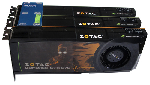 Zu Beginn des Jahres haben wir bereits die GeForce GTX 570 in einem Einzeltest genau unter die Lupe genommen. Damals fand ein Exemplar von Hersteller ZOTAC den Weg auf unseren Prüfstand und konnte im Test durchaus überzeugen. Vor einigen Wochen folgte dann der SLI-Test, basierend auf zwei baugleichen GeForce GTX 570 Grafikkarten aus dem Hause Club 3D. Mit dem heutigen Test legen wir nun im warsten Sinne des Wortes "noch einen drauf" und untersuchen drei ZOTAC GeForce GTX 570 Boards in einem 3-Way-SLI-Setup! Wie gut dieses Gespann im Vergleich zu den beiden bereits getesteten Varianten skaliert, klären wir auf den folgenden Seiten. Ebenso interessant war für uns die Gegenüberstellung mit der GeForce GTX 590 und der Radeon HD 6990, den beiden schnellsten Einzelkarten auf dem Consumer-Markt.