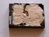 Bevor man den Kühlblock auf die Festplatte schrauben kann, muss zunächst eine Verbindung zwischen Festplatte und Kühlblock geschaffen werden. Für diese Verbindung wird das Wärmeleitgel mitgeliefert. Das Füllmaterial ist getrennt verschweißt und muss vor der Verwendung mit zum Beispiel einem Löffel miteinander vermixt werden. Vermeiden sollte man unsaubere Werkzeuge oder sonstige Untensielen die Rückstände von Chemikalien oder Farbe aufweisen, da dies dazu führen kann, dass das Leitpad nicht mehr vollständig aushärtet oder das Wärmetransferpotenzial sinkt. Da das Material nicht flüssig ist und auch keine Leitfähigkeit besitzt, kann es auf die Rückseite der Platte mit geeignetem Werkzeug aufgespachtelt werden.