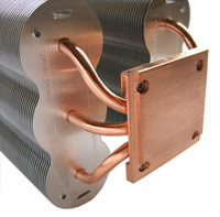 Was darf bei einem Kühlerroundup nicht fehlen? Richtig, Hersteller Thermaltake! Und schon beim Öffnen der Verpackung setzt sich das Unternehmen wieder richtig ins Szene und besticht durch ein reichhaltiges Zubehör, zumindest was den Bereich der Plattform-Kompatibilität betrifft. Der SonicTower ist nicht nur in der Lage Prozessoren der 7. und 8. Generation von AMD (Sockel 462(A)/754/939/940) zu kühlen, sondern auch Intels Sockel 478 und LGA775. Für insgesamt etwa 25 Euro Anschaffungspreis bekommt man zudem noch eine ausführliche Bedienungs- und Installationsanleitung und ein wenig Wärmeleitpaste. Zwei spezielle Halterungen ermöglichen des Weiteren den Einsatz eines optionalen 120 mm Lüfters für den aktiven Betrieb des SonicTower 4in1. Offizielle Informationen über die maximalen Frequenzen und Prozessormodelle die mit dem Thermaltake-Kühler betrieben werden können, liegen leider nicht vor - sämtliche Sockel A CPUs bedenkenlos tauglich. Die Montage des Passiv-CPU-Kühlers ist im Falle des AMD64-basierten Systems denkbar einfach und relativ fix erledigt: Eine in den Körper eingeschobene Klammer wird mittels zweier Schrauben an der bestehenden Backplate des Mainboards festgeschraubt und sichert den festen Halt. Die Verarbeitung des Boliden ist Tt-typisch gut und gibt keinen Grund zur Kritik.