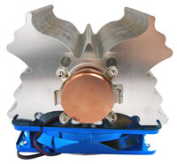 Mit etwa 620 Gramm (ohne Lüfter und dessen Gitter) ist der Vanessa L-Type von Titan (150 x 130 x 118 mm), wie seine Kollegen, alles andere als ein Leichtgewicht - 820 Gramm mit aktiver Kühlung. Gerade die mächtige Kupfer-Heatpipe im Zentrum des Kühlers, welche zugleich auch den Kühlerkern darstellt, sorgt mit 2,5 cm Durchmesser für ordentliches Gewicht. 34 Aluminium-Lamellen sollen für den weiteren Abtransport der Wärme sorgen. Ob sich der Titan Vanessa L-Type durch die lineare Pipe in der Mitte einen Vorsprung erarbeiten kann, sehen wir nun auf den folgenden Seiten.