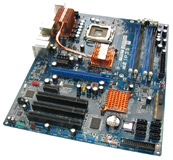 Prinzipiell hat Abit das IP35 als Standard-ATX-Platine konzipiert und muss auf den vorgegebenen Abmessungen (12,0 x 9,6 Zoll) die zahlreichen Ausstattungsmerkmale unterbringen. Das Dual-Chipsatz-Design sieht dabei die traditionelle Aufspaltung des Layouts in zwei wesentliche Bereiche vor. Legen wir die Platine richtig herum vor uns und ziehen direkt unterhalb des Back-Panels einen waagrechten Strich über das Board, finden wir oberhalb dieser Linie die P35-Northbridge (Intel MCH), den LGA775 CPU-Sockel, sowie vier DDR2-DIMM-Sockel für bis zu 800 MHz schnellen DDR-Speicher der zweiten Generation. Die Kühlung der Komponenten ist durchweg passiv, setzt auf eine Heatpipe-Verbindung zwischen den Spannungswandlern und der Northbridge und wurde unter dem Markennamen "Silent OTES" zusammengefasst. Die Southbridge ist vom Rest der Kühlung entkoppelt. Des Weiteren finden wir einen 4-Pin Anschlus namens ATX4P1 auf der Platine. Dieser Port soll Grafikkarten im PCIEXP1-Slot mit zusätzlicher Leistung versorgen - ein Feature das wir vor allem von den ersten PCIe-Boards kannten, als Netzteile mit PCI Express Stromanschlüssen kaum verbreitet waren. Das "übliche Problem" zwischen den DIMM-Sockeln und dem primären PEG im Zusammenspiel mit langen Grafikkarten besteht auch beim Layout des IP35: Die Sicherungshaken der DDR2-Module sind bei installierter Grafikkarte nur eingeschränkt zu betätigen. Ein Manko, aber kein schwerwiegender Fehler im Layout.